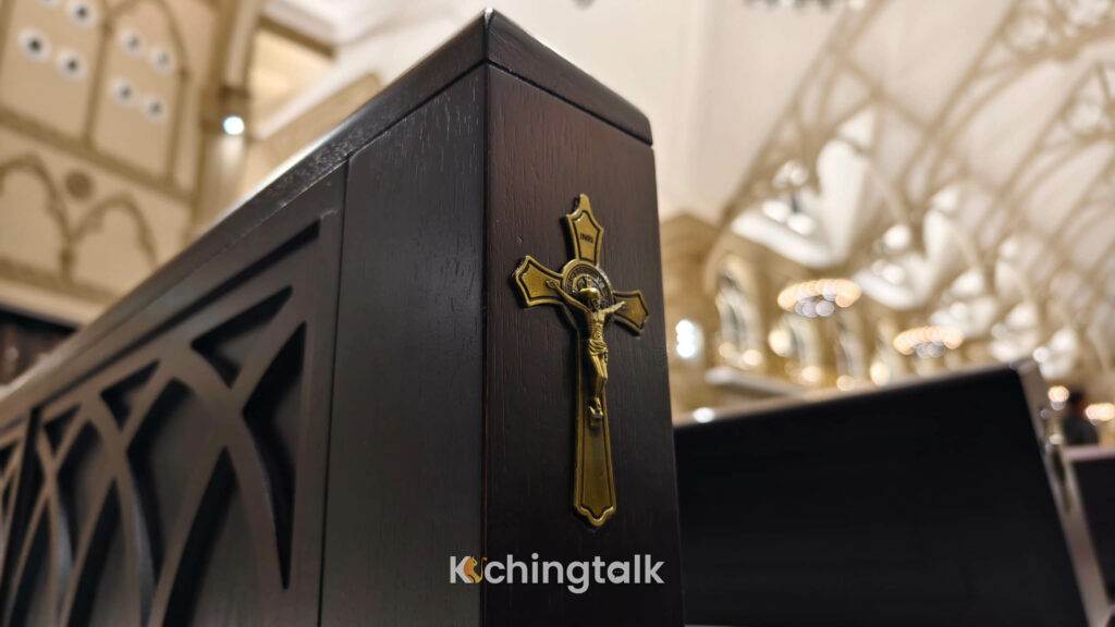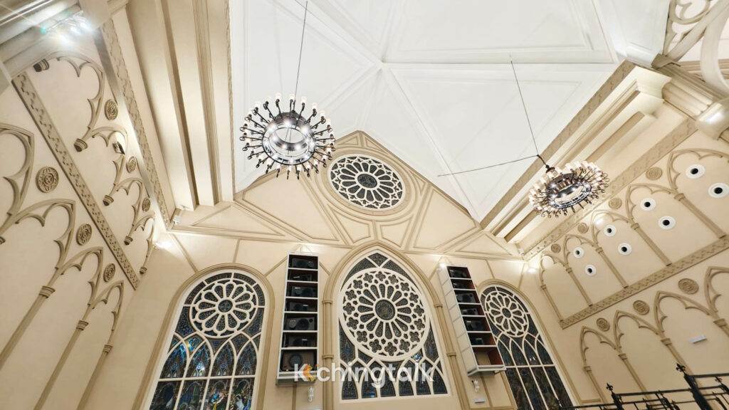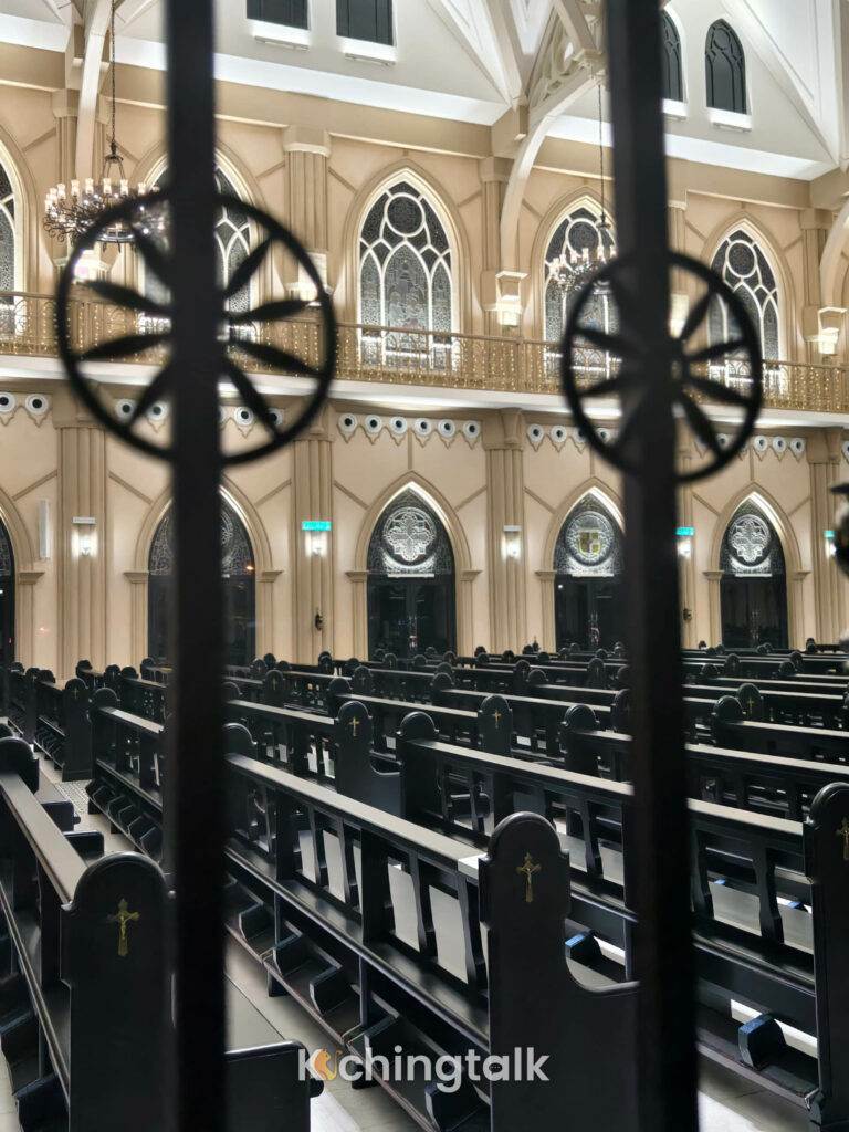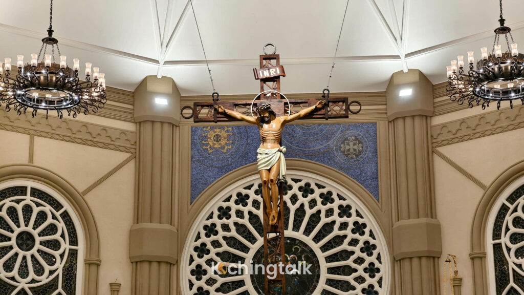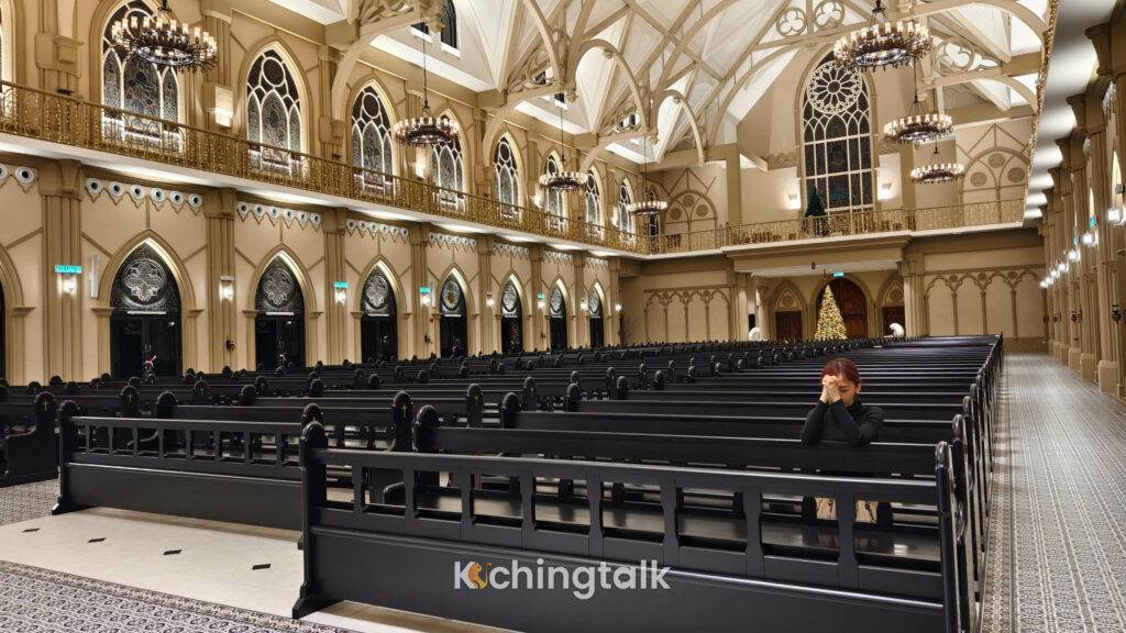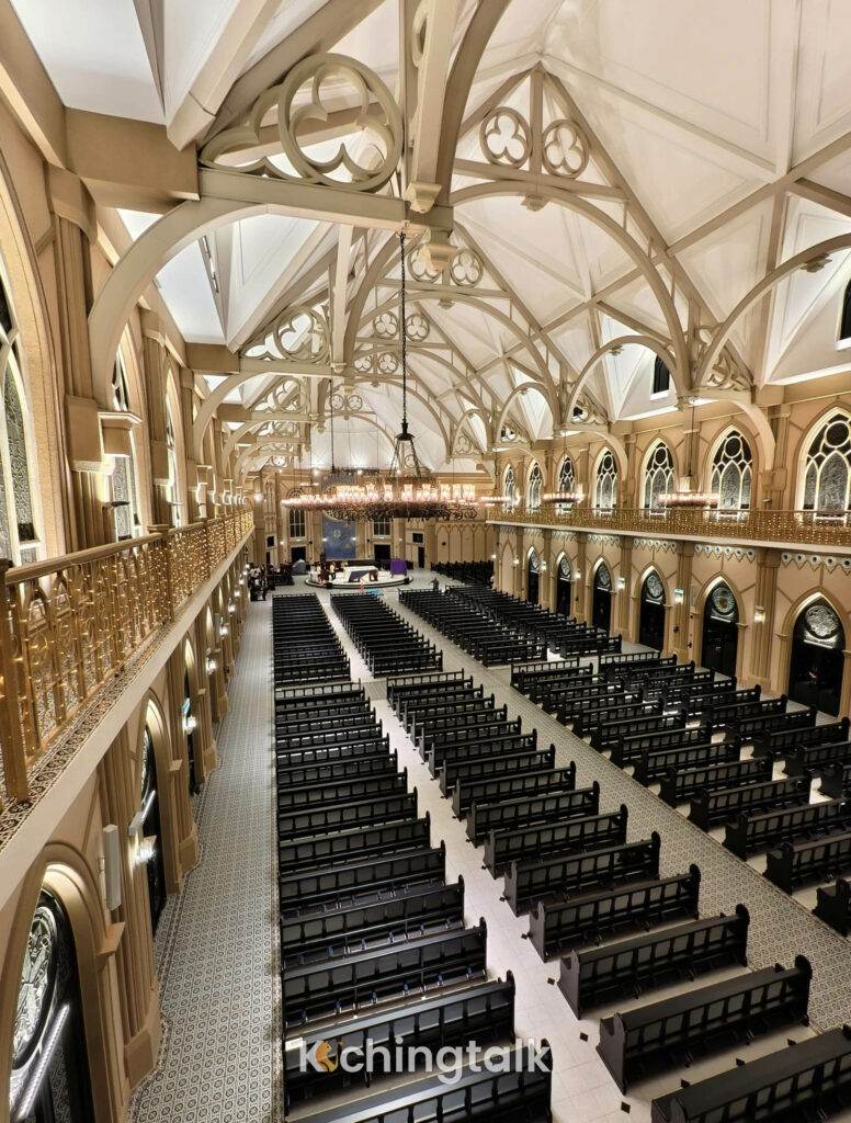 新教堂的设计融合了欧洲哥特式建筑的典型元素,如尖形拱门、飞扶壁和肋状拱,体现了传统与现代的结合。内部装饰的68幅彩绘玻璃描绘了耶稣一生中的重要事迹,其中14幅展示了拜苦路的情景。这些玻璃还融入了当地达雅族的传统图案,增添了独特的文化气息。此外,教堂设有两座高约105英尺(约32米)的钟楼,耸立在面向中央路的方向,成为古晋市的新地标。