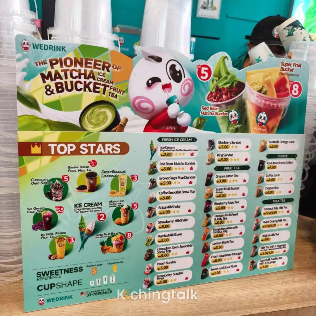 WEDRINK位于以前的大城小店旁,紧邻Wefusion。凭借创新的商业策略和超值的优惠,它迅速占领了古晋的饮品市场。标价仅RM5.50的珍珠奶茶不仅价位亲民,而且还附赠一支可口的冰淇淋!让消费者真正感受到物超所值。