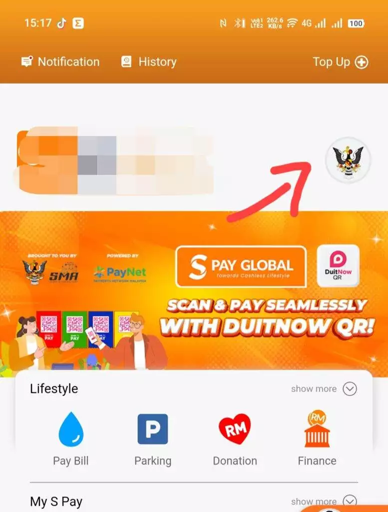 1. 打开你的Spay Global App,首页点击右上角的犀鸟图案